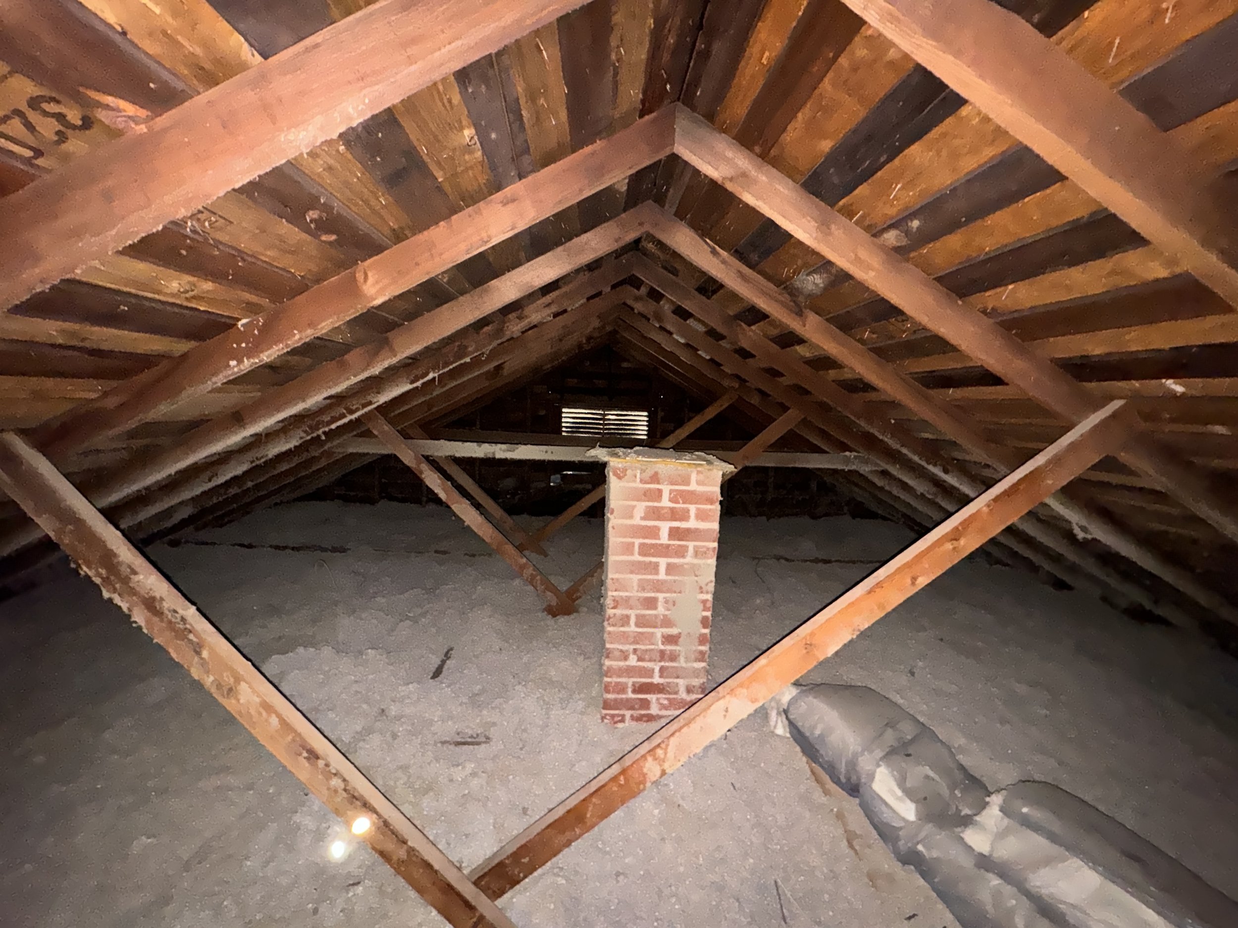 Attic space with wooden rafters and a brick chimney stack, cellulose insulation covering the floor prepared for removal, and exposed beams.